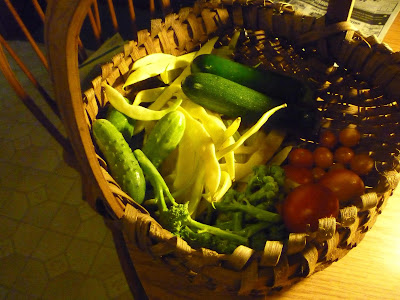The picture above and the picture below show the gist of what I've been bringing in this week. The tomatoes are still ripening maddeningly slowly while the plant disease is moving maddeningly fast. Cucumbers are coming in at a good pace and this year we have refrigerator dills again. Yay! And though the photo is a bit unclear, at the top of the basket there are two zucchini! They are from the second planting of zucchini after the failure of the first. Not a lot, but still...